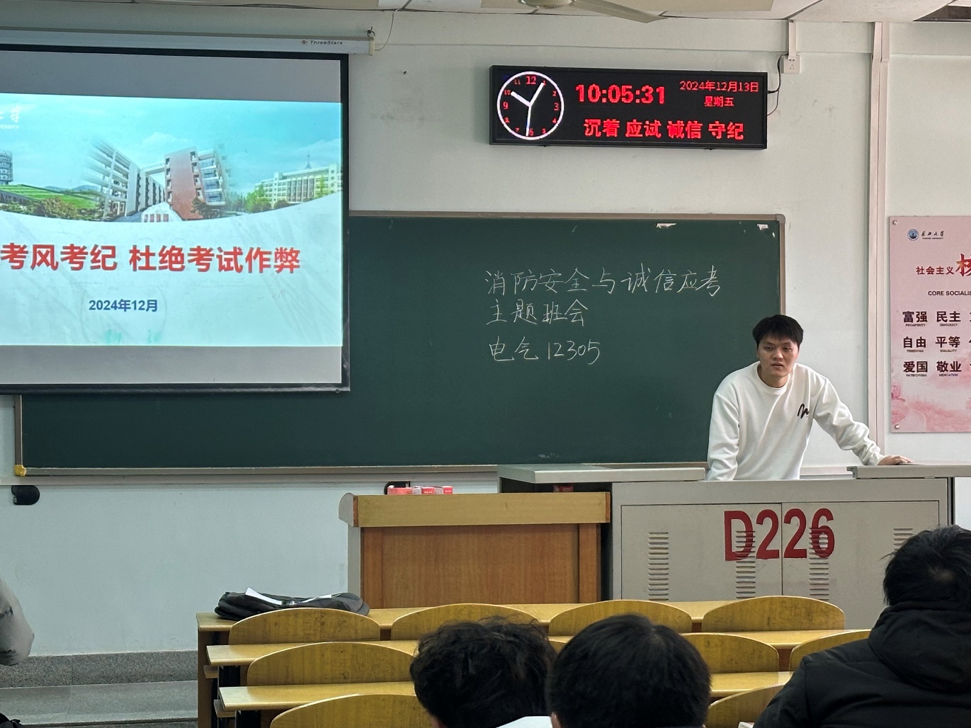 通过本次班会的开展,同学们在消防安全、诚信应考等方面都收获了丰富的知识,增强了自我保护意识和责任感。后期,我院将继续按照学校要求,全方位开展宿舍安全隐患排查工作,确保各项工作落到实处。