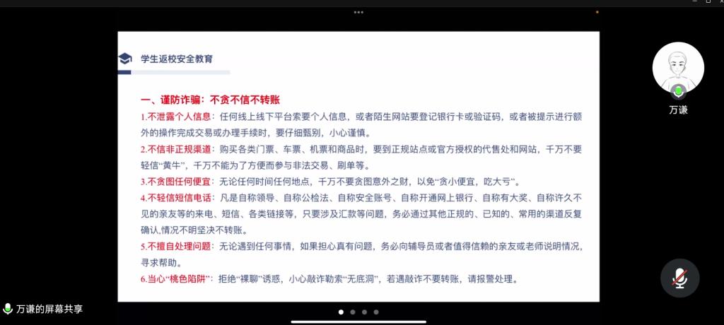 2月13日前,各班级以线上方式召开了返校安全教育主题班会,辅导员、班主任在会上强调了返校交通安全、心理健康调适、宿舍卫生整理、学风建设与生涯规划等内容,提醒同学们做好返校途中安全防护,返校后开展宿舍卫生整理,并尽快调整作息和生活状态,以饱满的精神迎接新学期。