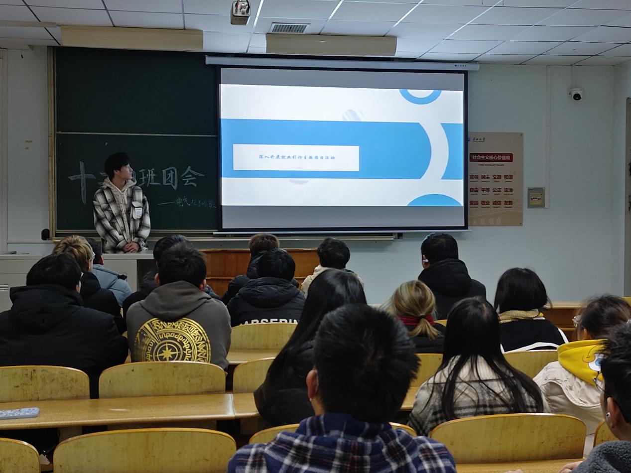 12月21日晚,电气12204团支部在13教D224举行班团会。会议伊始,许子寒同学带领支部团员和青年们学习了解新时代新征程党和国家事业发展的目标任务,深刻理解中国式现代化是强国建设、民族复兴的唯一正确道路。读原著学原文悟原理,组织开展“挺膺担当”主题团日学习。会上,许子寒同学结合参加校内外各类实践实习活动,组织开展故事分享、体验交流等活动,帮助本班同学了解国情、社情、民情,提升对个人价值实现、职业发展规划等方面的理性认识。团会还开展了“对标定级”工作,团支部对过去一年的活动情况进行自评定级最后,主持人带领同学们完成第二十二期“青年大学习”网上主题团课学习。