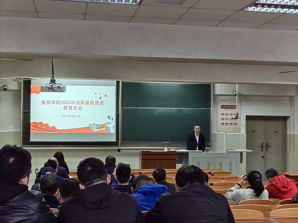 4月14日下午,在主教108教室,学院党委副书记郭启炜在本年度学院党风廉政建设教育大会上向全院教职工传达了学校纪委“加强同级监督、政治生态分析研判工作布置会”会议精神,会上带领全院教职工一起学习了《中共长江大学委员会关于推进清廉长大建设的实施方案》、《中共长江大学委员会关于推进风清气正政治生态建设的实施办法(试行)》、《校纪委 “5384”行动计划推动清廉长大建设》等文件精神,解读《筑牢“清廉电信学院”建设工作方案》,详细讲解了“筑牢清廉电信学院”的四个工程(“政治清明”建设工程,“院风清朗”示范工程,“教风清正”保障工程,“学风清新”培育工程)和12个方面的内容(压实全面从严治党主体责任、加强党员干部思想政治教育、弘扬“拼、抢、严、实”工作作风、加强清廉班子建设、加强清廉机关建设、加强清廉支部建设、加强清廉系部建设、落实立德树人根本任务、落实教师学习和培养机制、引导教师规范自身言行、推动“清廉文化”进班级和落实“三全育人”新途径)。