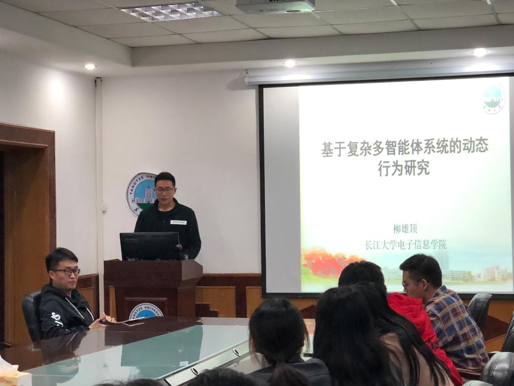 第一个进行汇报的是检测技术与自动化装置专业的柳雄顶同学,他的题目是《基于复杂多智能体系统的动态行为研究》,从三个方面展开了论述,分别是多智能体的介绍(群集、蜂拥、集结、一致性、同步)、复杂网络传播动力学研究、编队控制(数学描述、动态分析、矩阵表现)。汇报结束后,参会的同学纷纷向汇报人请教问题,研一的一位同学问道:“如何确定自己的研究方向来确定自己的论文题目呢?”,又有同学问道:“在写论文前有哪些准备工作呢?”。面对这些问题,汇报人都一一耐心的回答,以过来人的身份向研一的同学传授经验。第二个进行汇报的是信号与信息处理专业的龚盼攀同学,她的题目是《基于云平台的垃圾回收与管理系统》,报告题目贴近生活,同学们听后都纷纷与汇报人交流,现场气氛热烈。