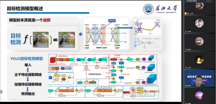 首先来自电子信息学院的郭奕裕同学以遥感目标检测为主要的研究方向,为同学们分享了他的研究内容《一种面向不平衡数据集的轻量化SAR舰船检测模型》,他从目标检测模型的本质与发展历程引入,为同学们介绍了现有目标检测模型存在的不足,提出了掩膜数据平衡增强方法,高效注意力机制模块、自适应的多尺度融合模块三个方面的改进方法。最后在论文方面进行了详细的论文结构讲解和文献检索、画图的辅助工具的分享。
